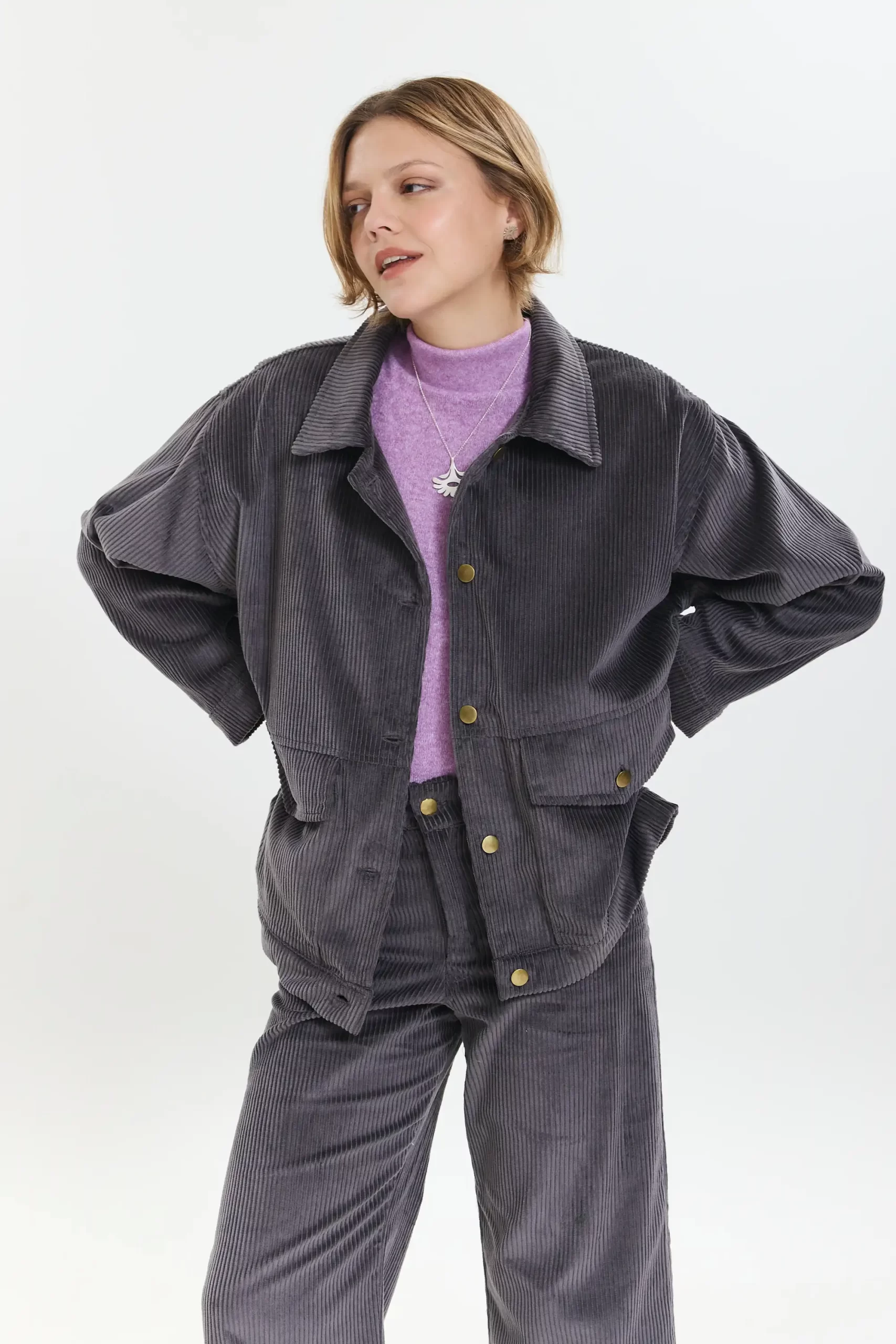 De estilo oversized, sisas amplias y maxi bolsillos delanteros, es ideal para looks urbanos y de todos los días.